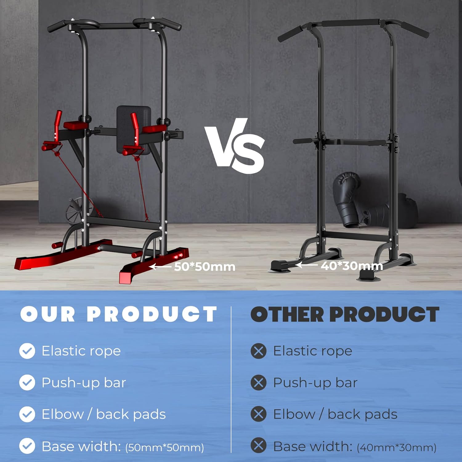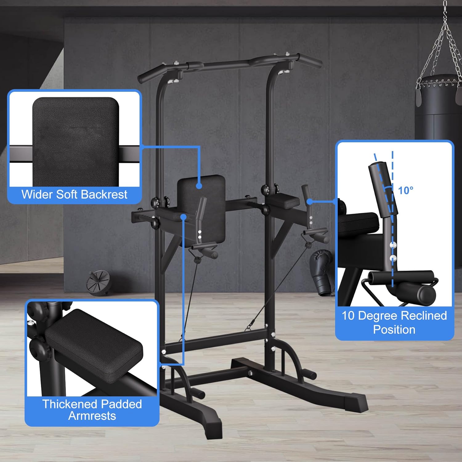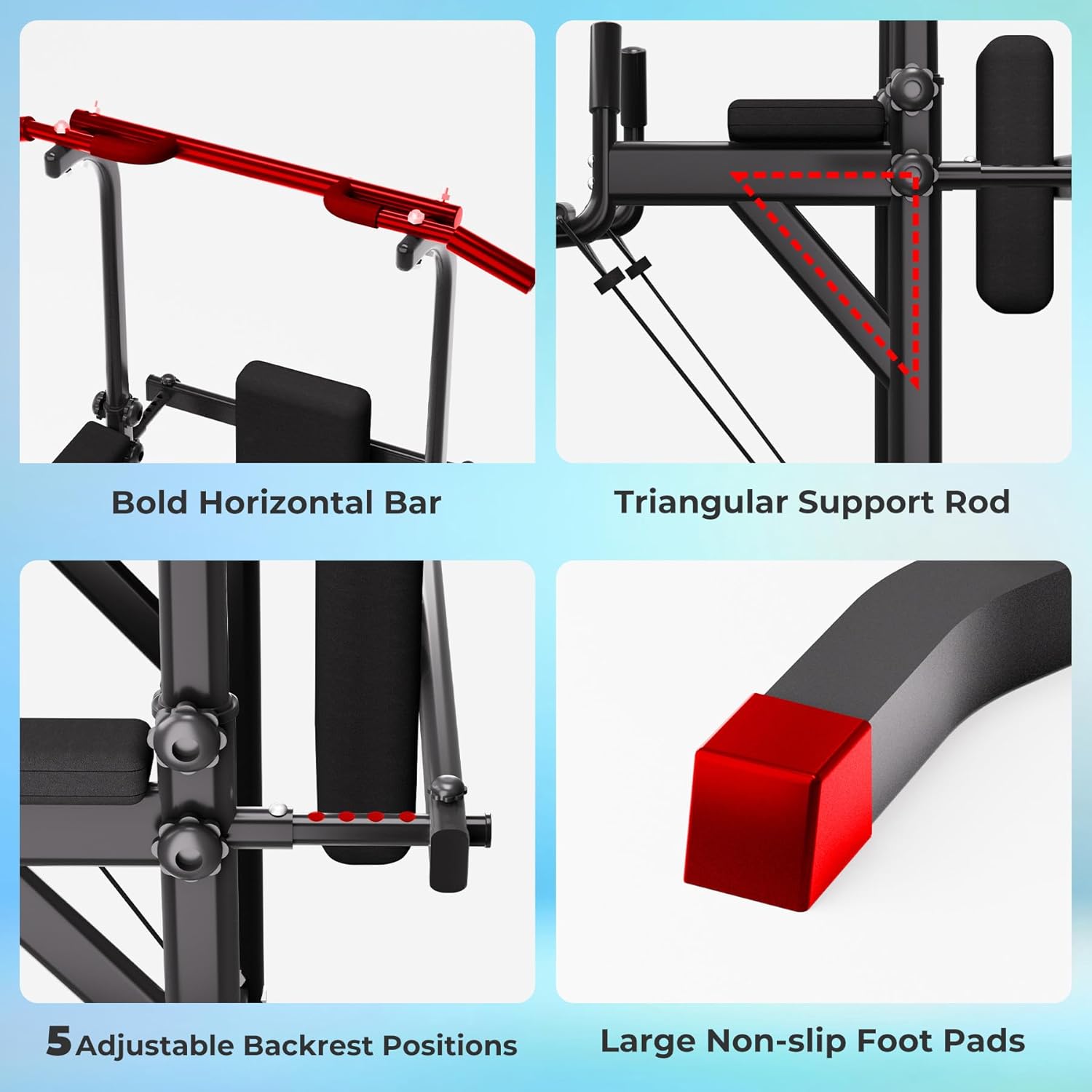 Excellent Stability and Safety: This pull up station comes with a heavy-duty steel frame constructed with scratch-resistant coat finish, which is super stable and durable. Extended feet design, which can widen the force area to make your power tower more stable. Vaccum pads will protect your floor, and dip bar will stand during the training firmly.