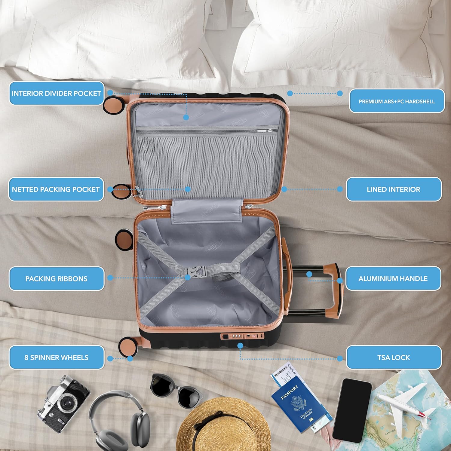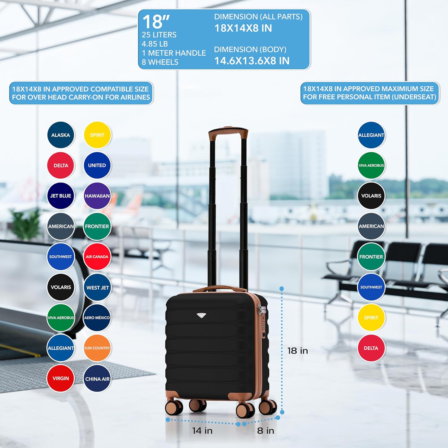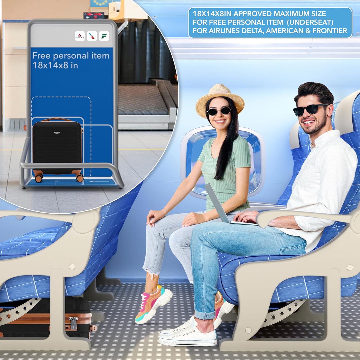 AIRLINE COMPATIBILITY: The cabin size luggage in this set is compatible with over 100 airlines operating in the USA and around the globe. The perfect size for a secondary carry-on (Personal Item) for American, Delta, Spirit and Alaska. Carry-On with Jet Blue (Blue, Blue Extra, Blue Plus and Mint fares) and United (Premier member or a primary card member) approved Airlines. Tested using the airlines baggage sizer this cabin bag comfortably fits under your seat and will avoid airline charges.