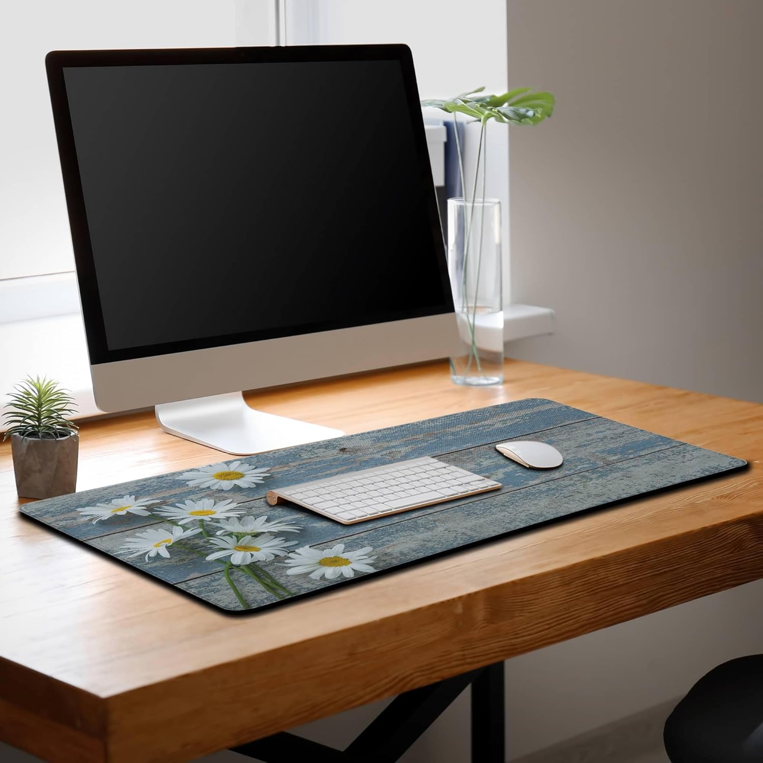 Computer Desk Mats Mouse Pads for Desk, Pc Mouse Pad Big Mousepads, Computer Desk Decorations Non-Slip Rubber Base, 35.4 X 15.7 inch for Work/Game/Office/Home Daisy Flowers on Old Wooden
