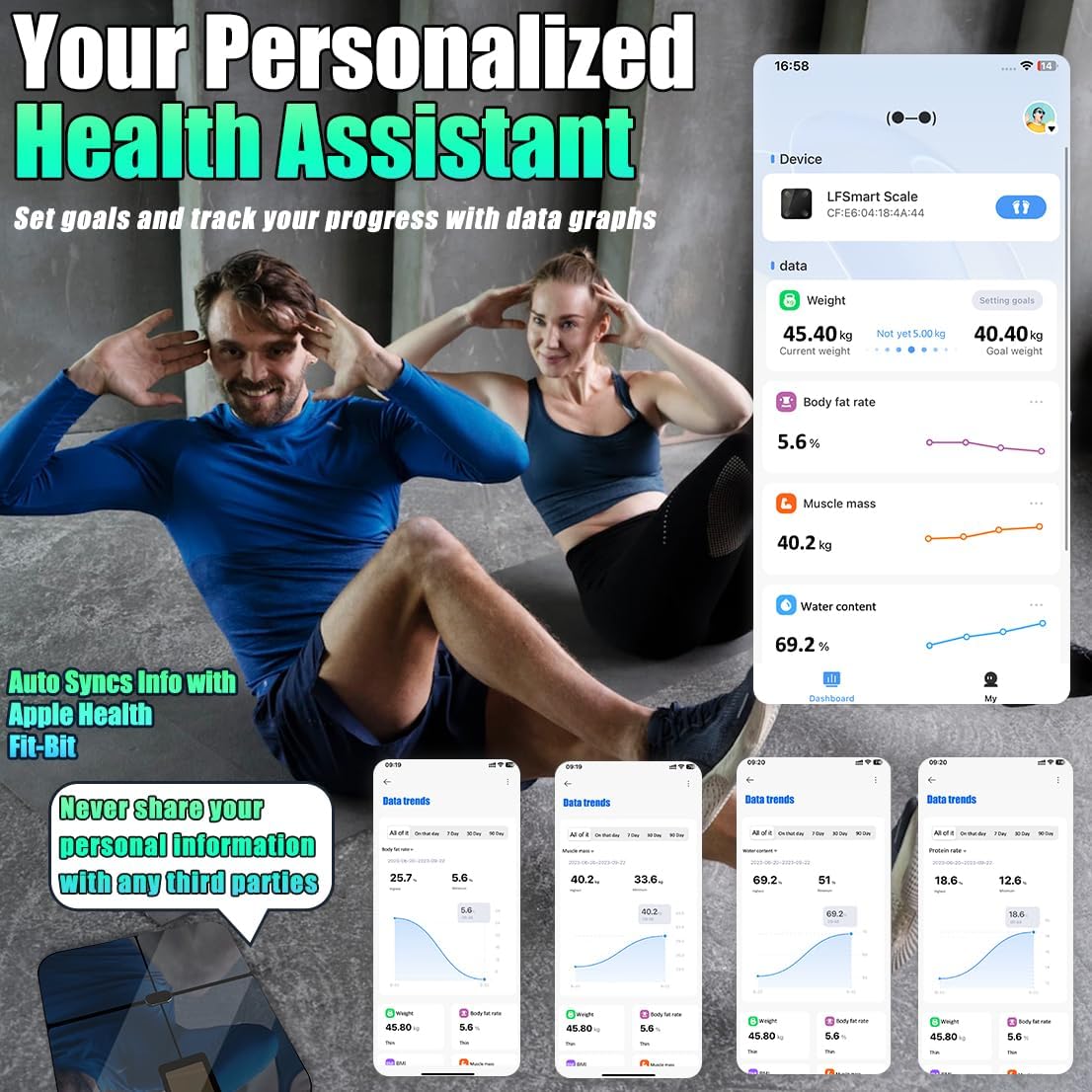 MAXIMUM PRIVACY PROTECTION – The app syncs information with Apple Health through data charts, allows WiFi connection, and works with Bluetooth 4.0 and above. It adheres to the highest privacy standards, meets GDPR compliance requirements, and employs additional security measures to protect all your health data. It does not share your personal information with any third parties.