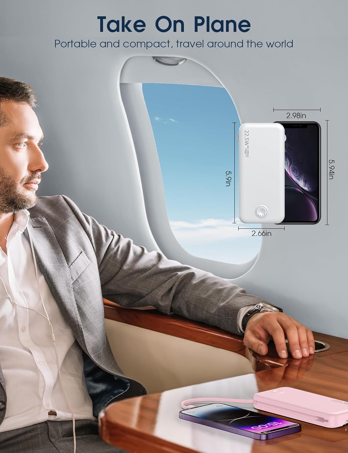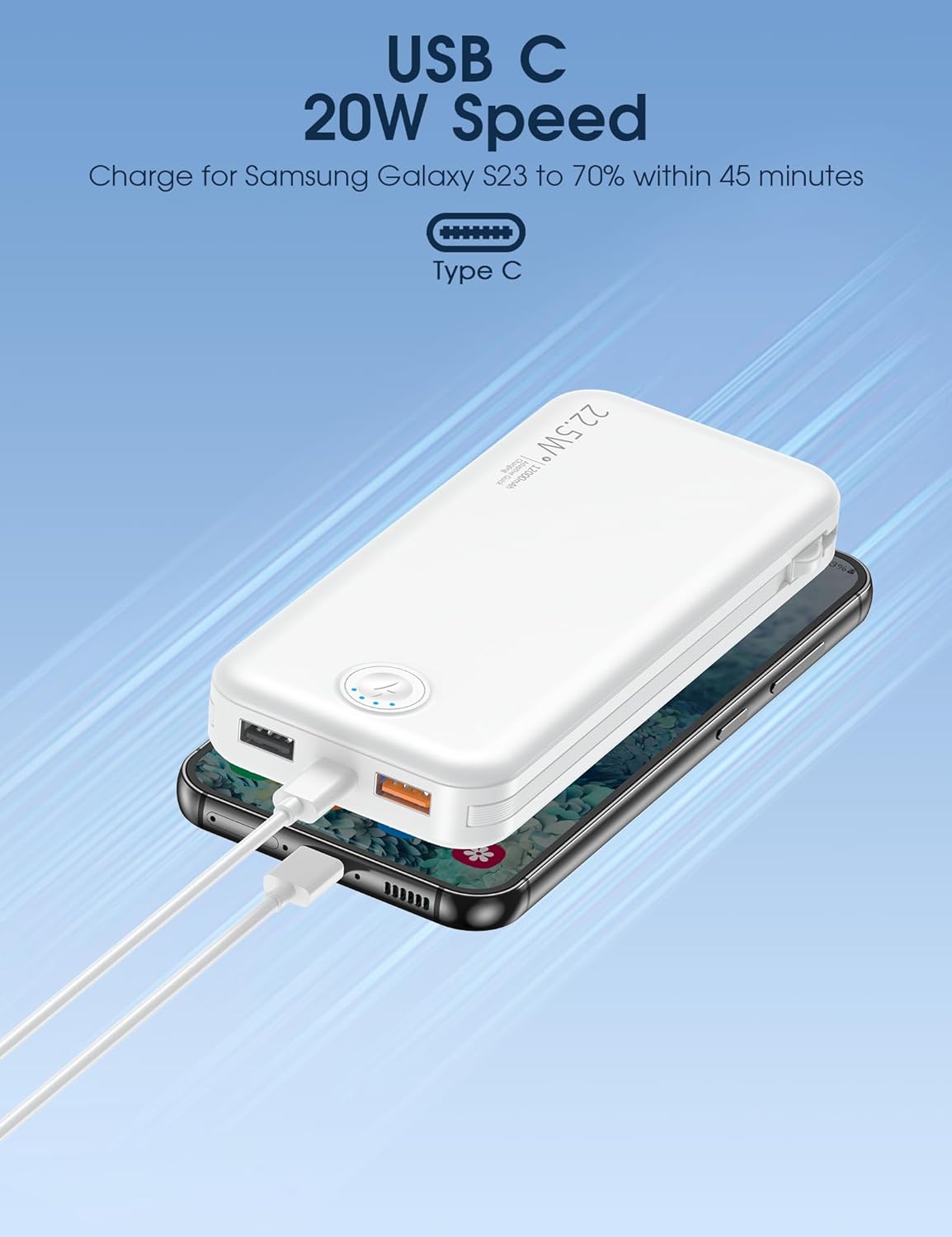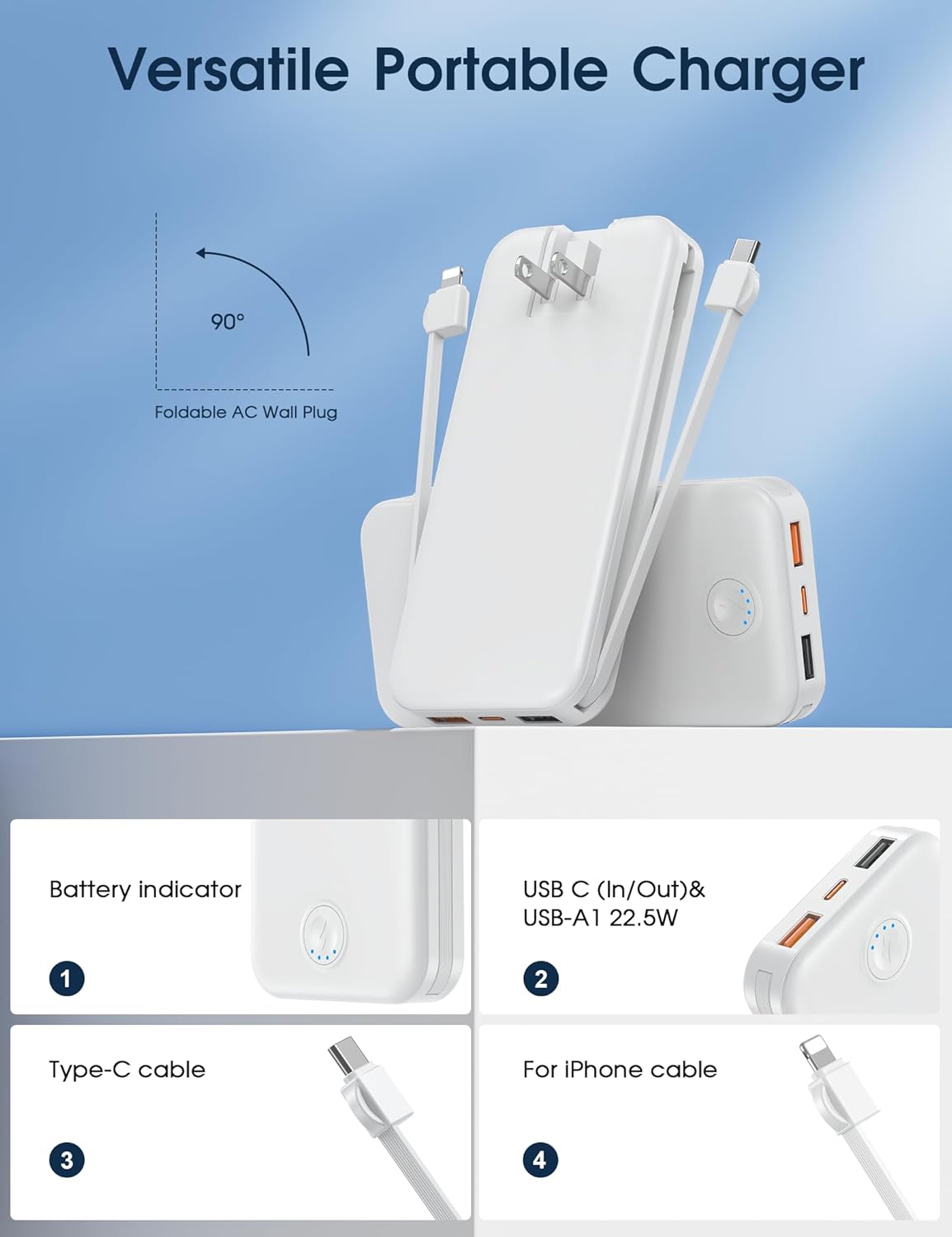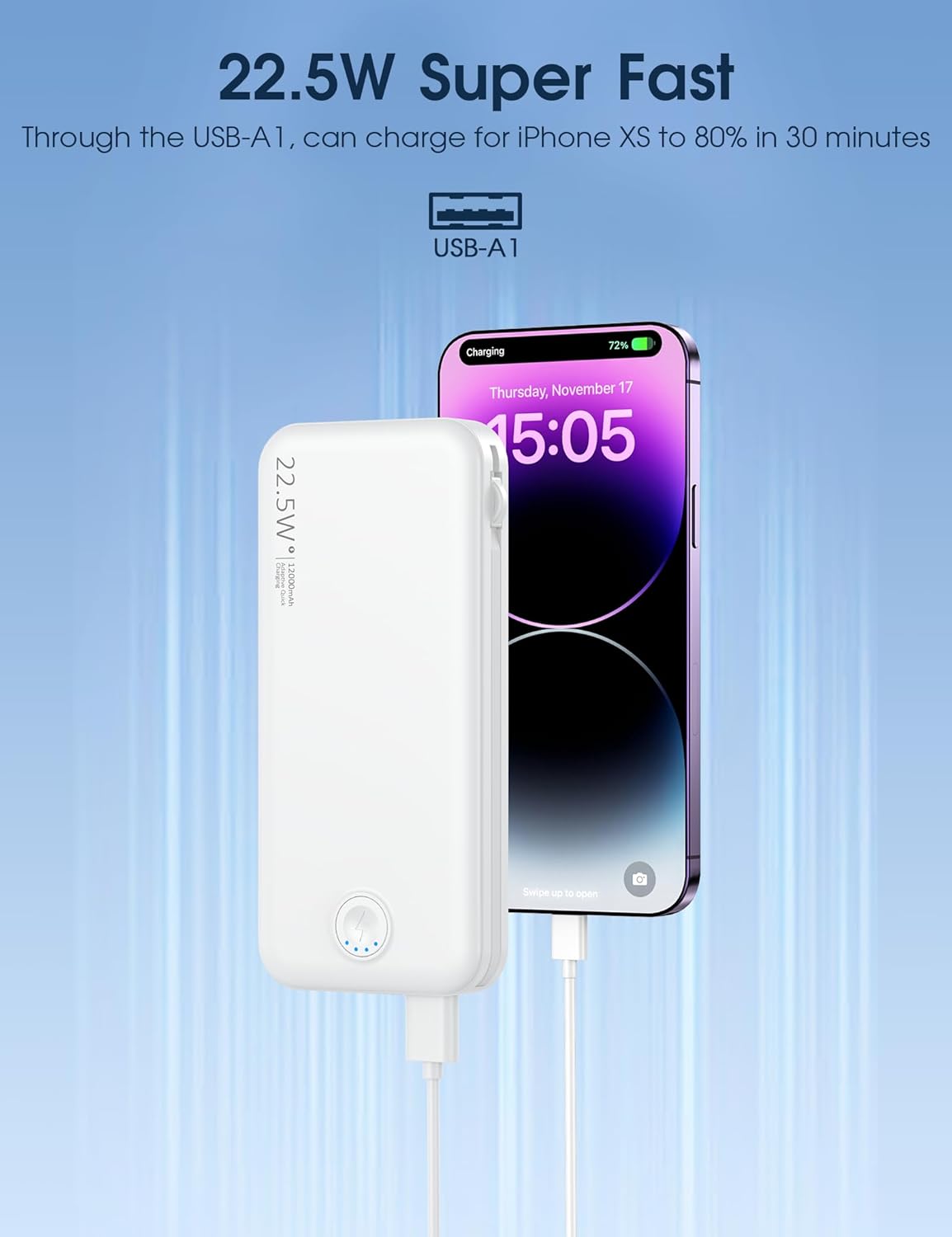 Portable Charger with Built in Cable and AC Wall Plug, USB C Power Bank 12000mAh 22.5W Super Fast Charging, Lightweight Portable Phone Charger Travel Battery Pack for iPhone, Samsung, Tablets