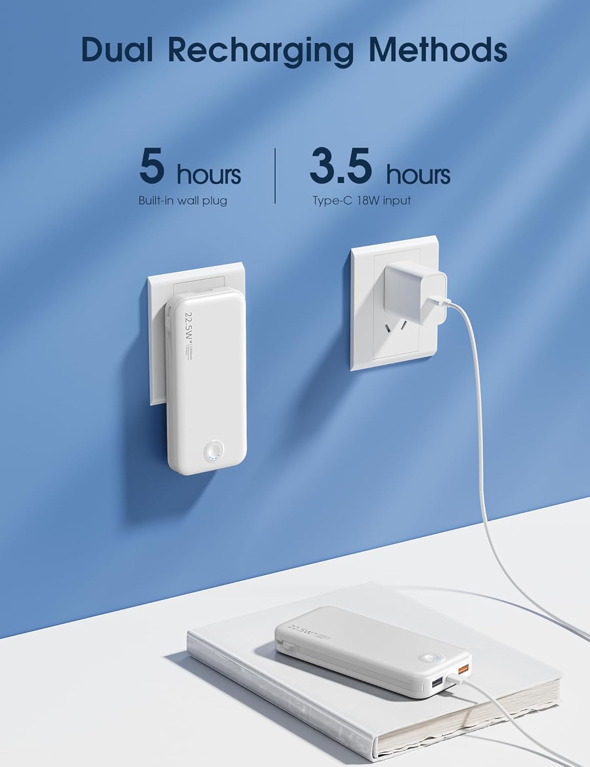 Portable Power Bank Comprehensive: This charging bank built-in USB C and for iPhone cables, top up your iPhone Android cell phones easily. The AC Wall plug allows you to recharge the portable charger directly from 100-240V wall socket, no need extra adapter, cords wherever you go.